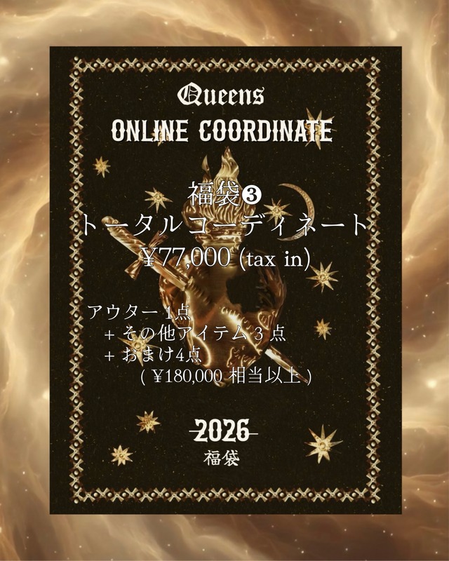 【Online限定】 Queens Online福袋 2026❸トータルコーディネート <内容> アウター1点 + その他アイテム3点でのトータルコーディネート + おまけ4点 (180,000円以上相当) 《 Online福袋購入手順 》 1. 購入 2. 下記メールアドレス or QueensのInstagramのDMに送信 ・購入時の名前 ・ご希望の性別 ・ 身長 ・ 普段のトップスとボトムスのサイズ ・ お好みの色合いや雰囲気 ⚠︎購入後24時間以内の送信にご協力ください。 ⚠︎24時間以内の送信がない場合は、Queens完全オリジナルコーデとなりますので、ご了承ください。 メールアドレス : [email protected] <販売期間> 2025年12月22日(月)21:00 start ※ご用意した予定数に達し次第、販売終了とさせていただきます。 Queensの福袋イベントで、2026年、新しい年のファッションをお楽しみいただければ幸いです。皆さまと、素敵なスタイルを共有できることを、心からお待ちしております。 ※お届け日は1月1日~1月5日とさせていただきますが、年末年始のため配送業者のご都合で前後する可能性があります。 ※返品、交換は不可となるためご了承ください。