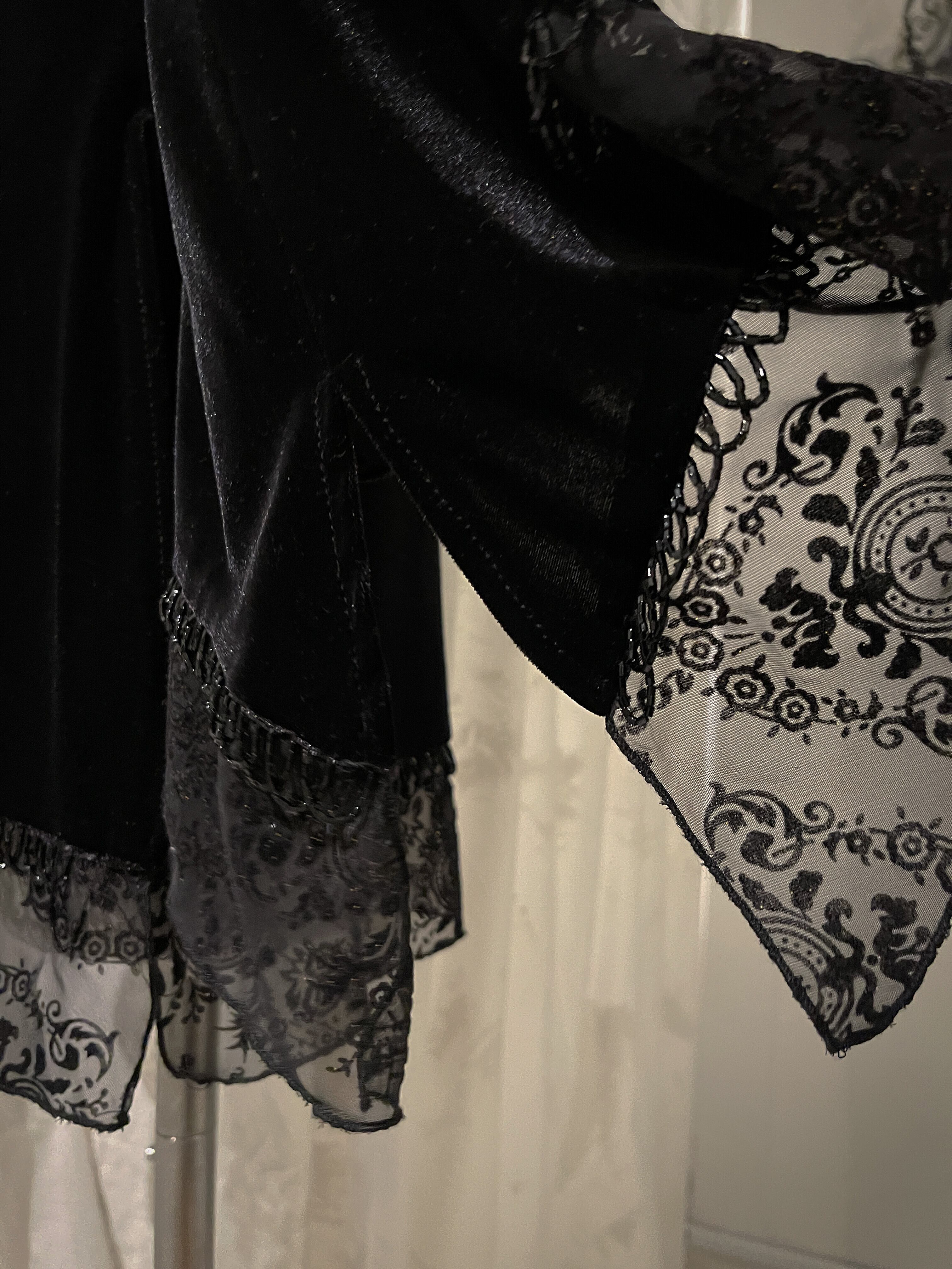 Black LaceTrimmed Angel Sleeve Velvet Blouse