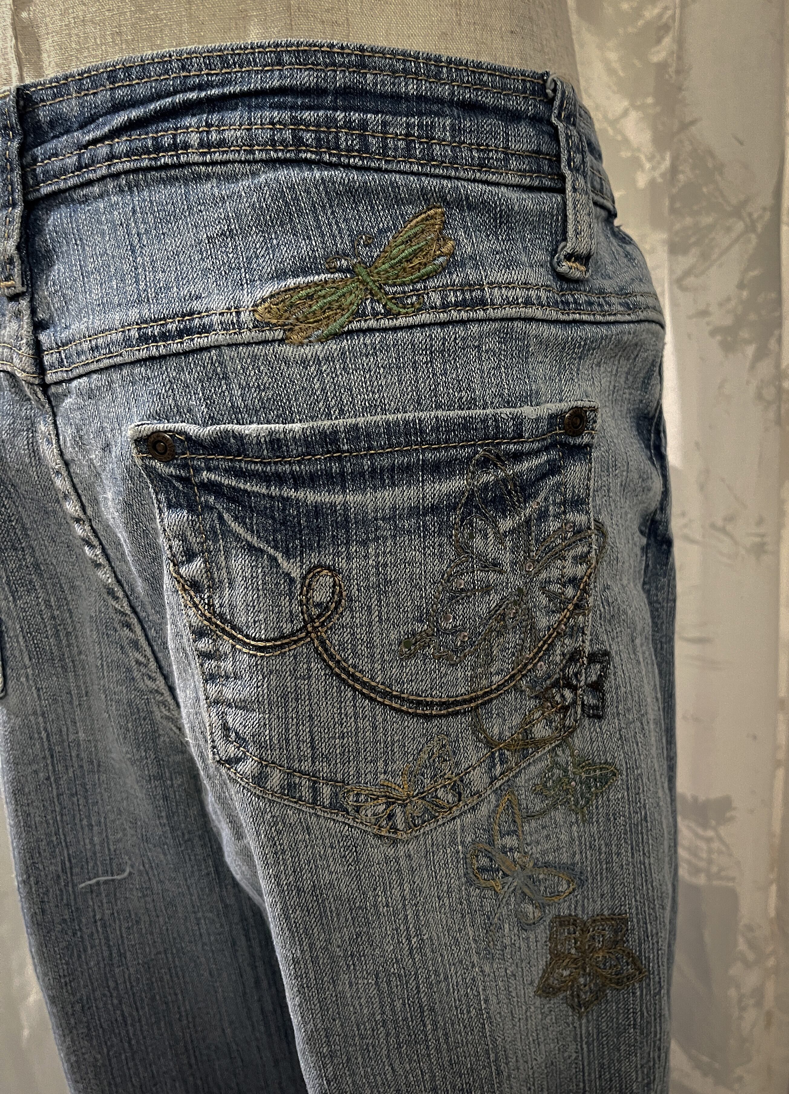 Butterfly Embroidery Semi Flare Denim Pants