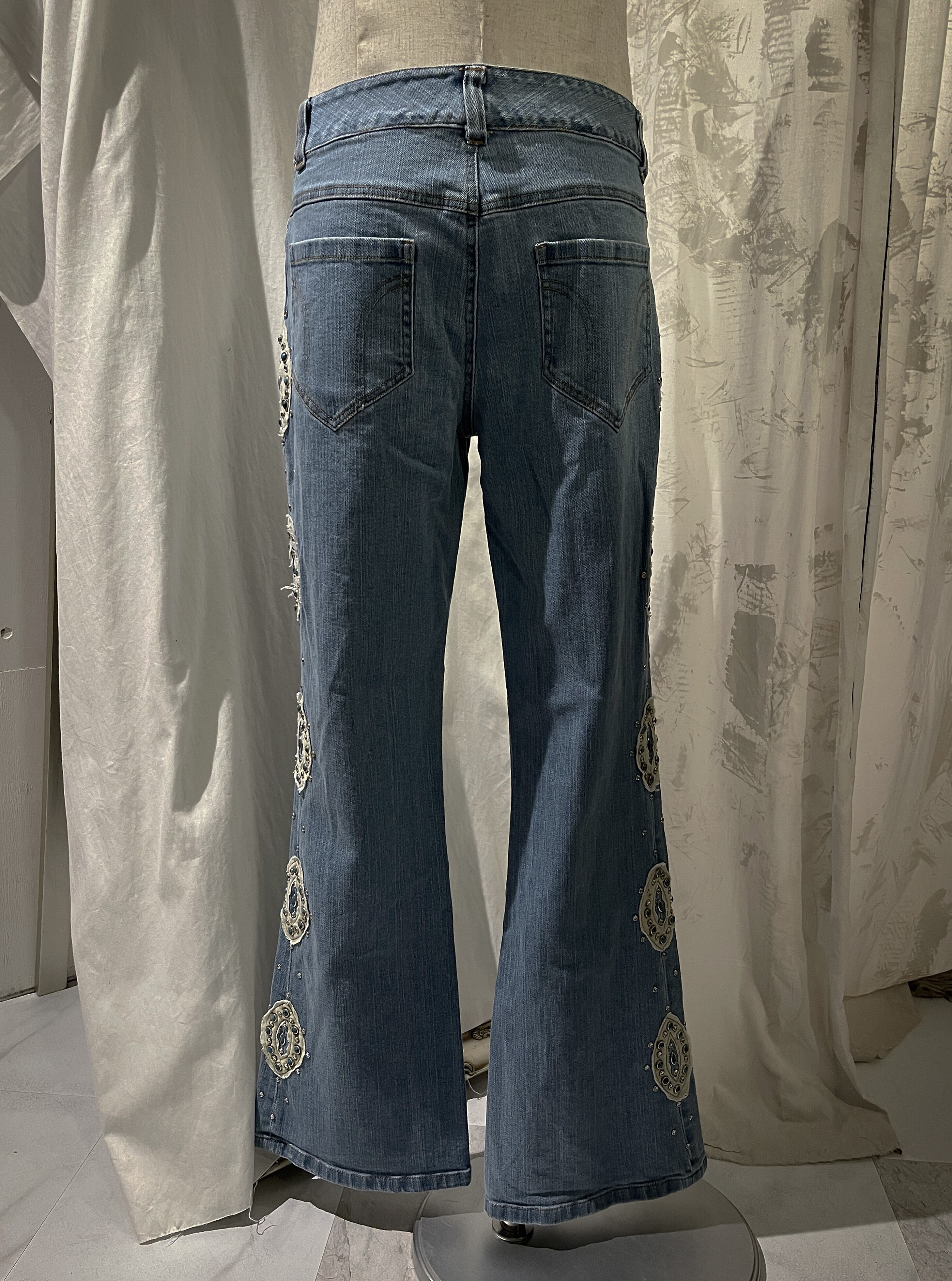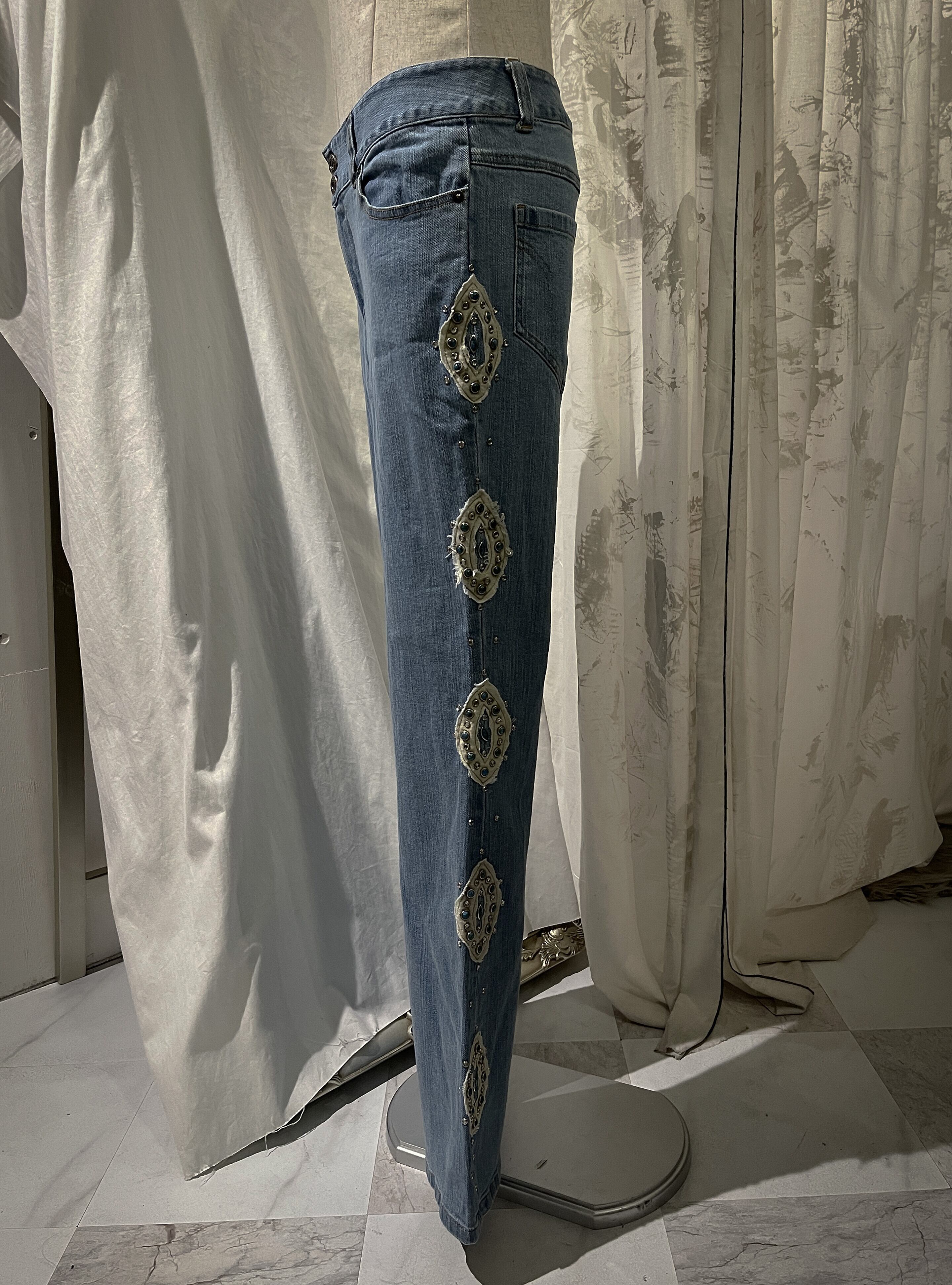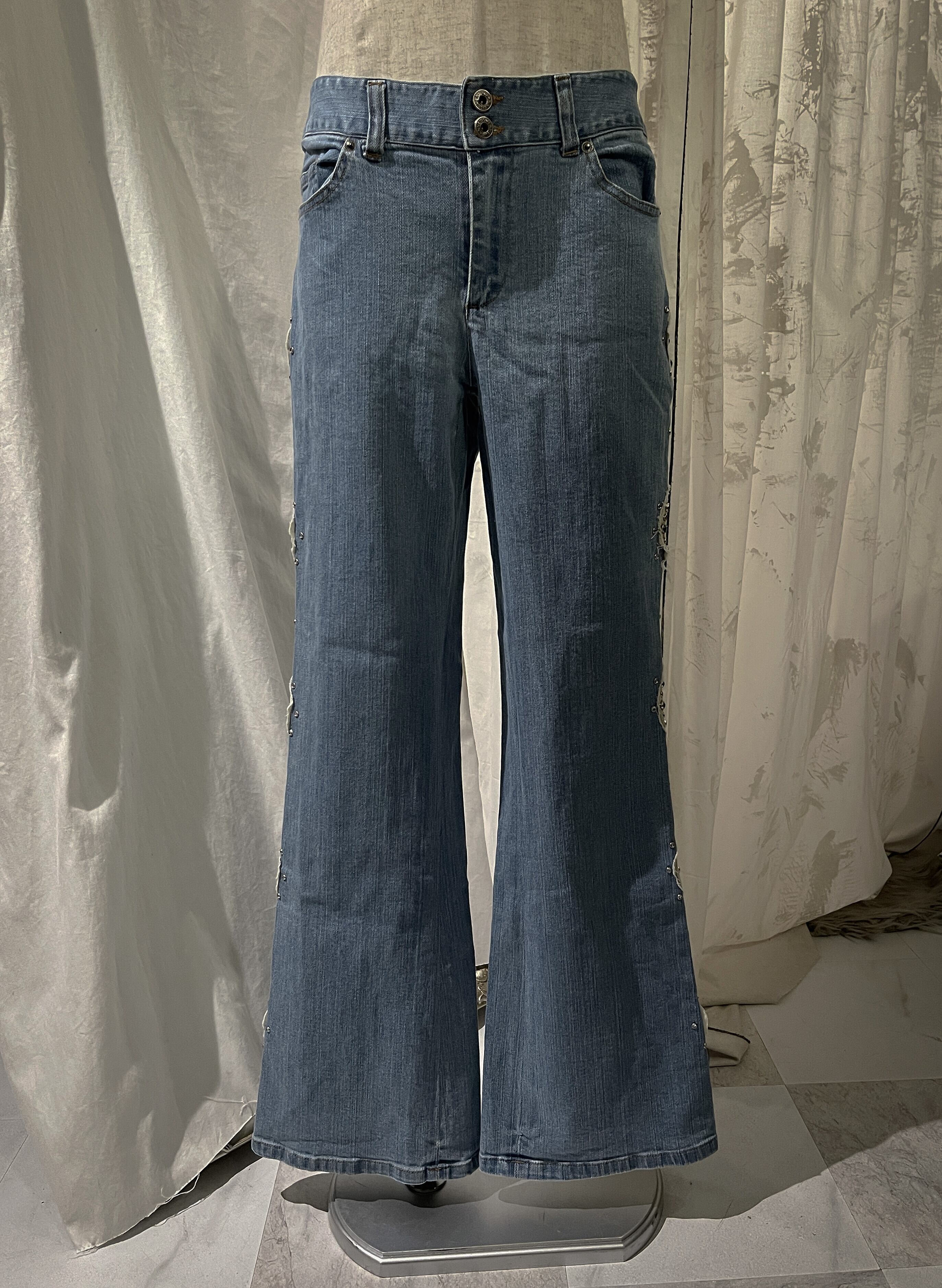Side White Bijou Light Blue Semi Flare Denim Pants