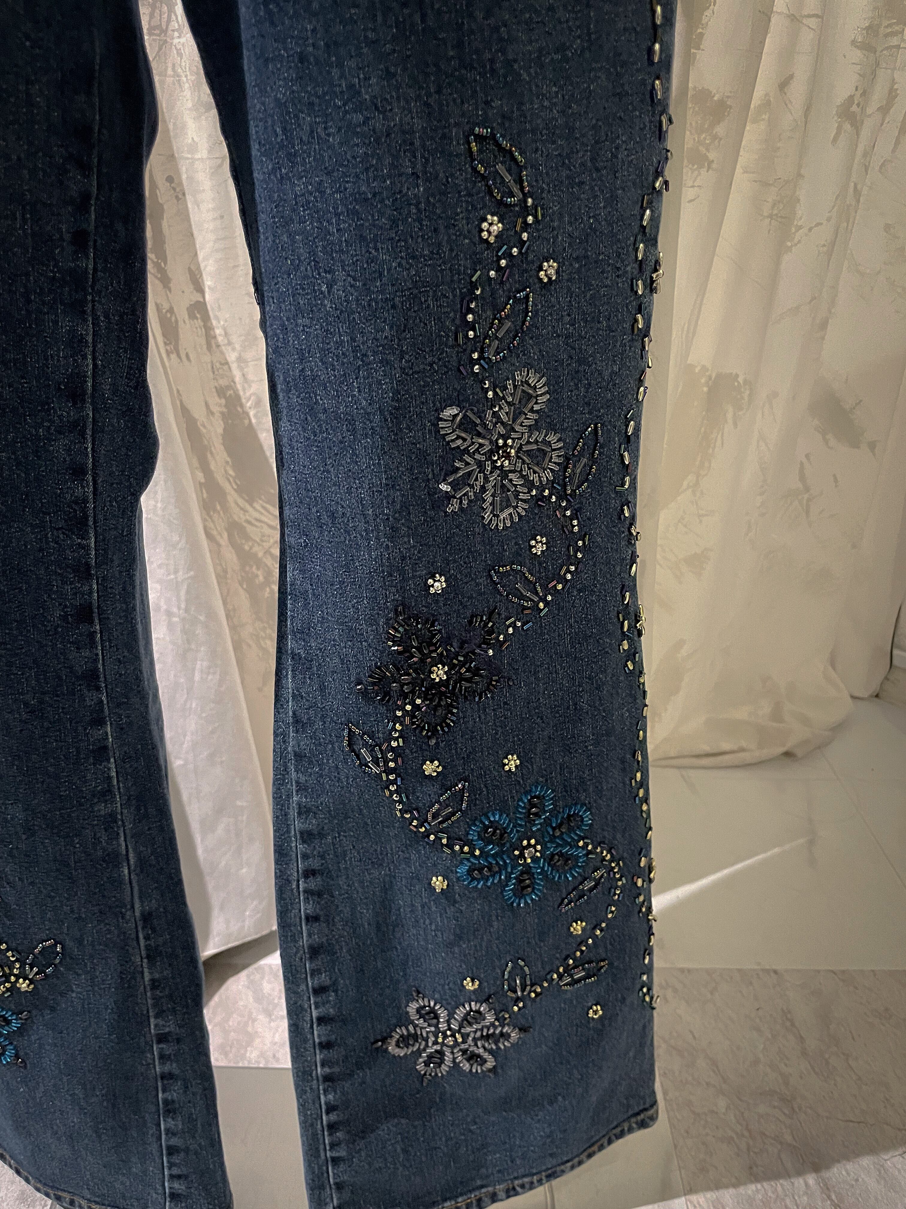 Blue Floral Embroidered Flared Denim Pants